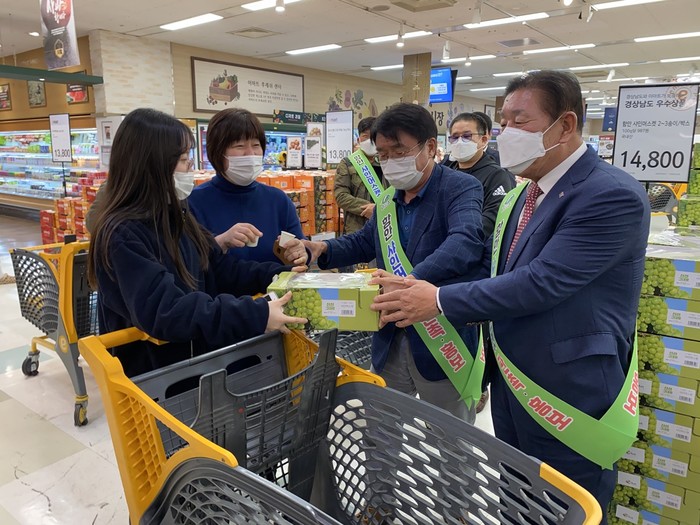 군은 본격적인 판촉행사에 앞서 지난 24일(토) e마트 대구월배점에서 조근제 함안군수, 이광섭 군의회의장 등 10여명과 e마트 박정환 상무 등 관계자 5명이 참석한 가운데 함안 샤인 머스캣 기획·판촉행사를 열었다.