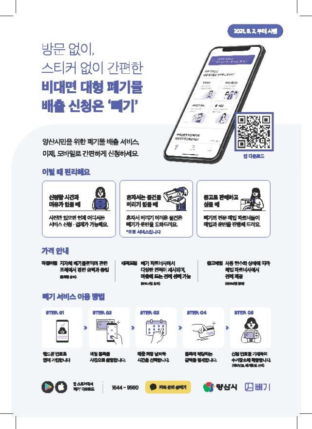 양산시는 8월부터 스마트 폰 앱을 이용하여 대형폐기물을 손쉽게 버릴 수 있고, 중고가구 및 가전 판매도 가능한 비대면 배출시스템인 “빼기”서비스를 시행한다.