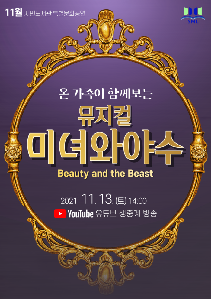 부산광역시립시민도서관(관장 김흥백)은 11월 13일 토요일 오후 2시 시민도서관 유튜브 채널로 온 가족이 함께보는 뮤지컬‘미녀와 야수’공연을 한다.
