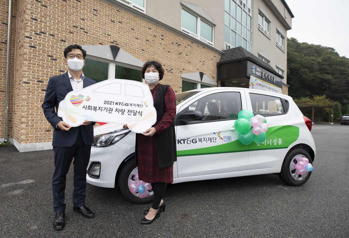 [시민일보 = 홍덕표 기자] KT&G복지재단이 지난 19일 용인시에 위치한 은이너싱홈 요양원에서 '2021 사회복지기관 차량 지원사업 전달식'을 열고 전국 사회복지기관에 경차 150대를 지원했다.