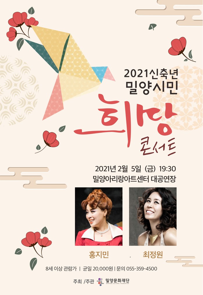 [밀양=최성일 기자]밀양문화재단(이사장 박일호, 이하 재단)은 2월 5일 저녁 7시 30분 밀양아리랑아트센터 대공연장에서 2021 신축년 ‘밀양시민 희망콘서트’를 개최한다고 밝혔다.