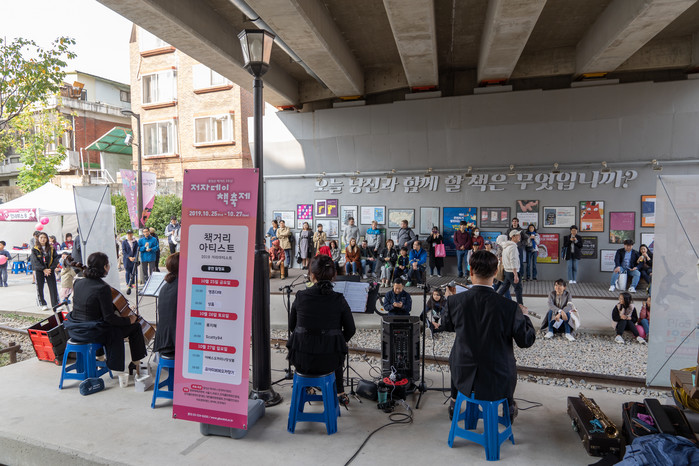 | ▲ 지난해 열린 경의선책거리 '저자데이 책축제'에서 책거리 아티스트들이 공연을 선보이고 있다. (사진제공=마포구청) |