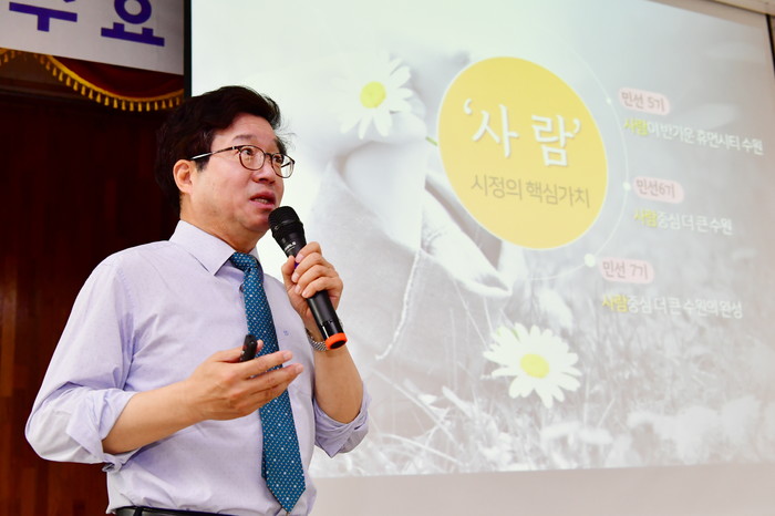 | ▲ 2019년 4월 염태영 시장이 수원지역 한 경찰서에서 인권도시수원을 주제로 강연을 하고 있다. (사진제공=수원시청) |