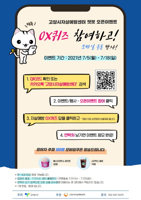 센터는 7월 5일부터 18일까지 오픈이벤트‘자살예방 O/X퀴즈’를 진행, 참여자 중 100명을 추첨해 소정의 상품(모바일 쿠폰)을 제공할 예정이다.