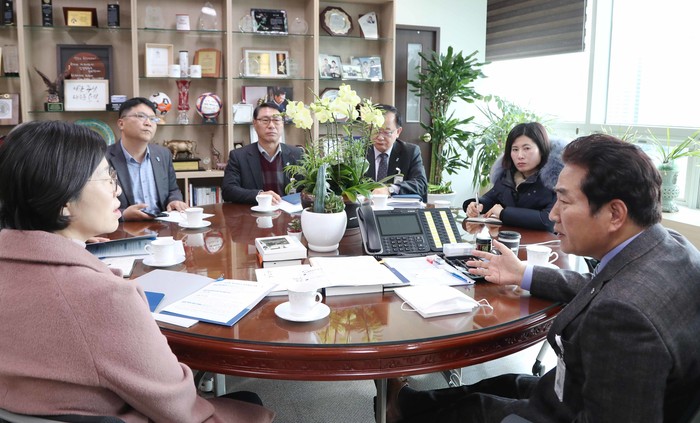 | ▲ 지난해 2월 백군기 시장이 국립농산물품질관리원을 찾아 관계자들에게 용인사무소를 처인구에 설치해야 한다고 요청하는 모습. (사진제공=용인시청) |