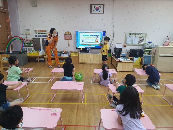 코로나19로 위축되어가는 소방안전교육을 수행하기 위해, 교육에 사용되는 기자재를 사전에 철저히 소독하고, 사회적 거리두기를 지키며 진행했다.