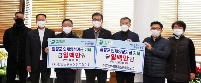 주포한옥마을민박협의회는 지난 11일 함평군인재양성기금에 100만원을 기탁했다. 같은 날 (사)함평군귀농어귀촌협의회(회장 박춘추)에서도 군청을 찾아 지역인재육성에 써달라며 함평군인재양성기금에 1백만 원을 전달했다.
