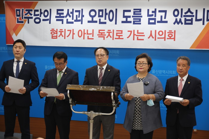 17일 울산시의회 프레스센터에서 미래통합당 울산시의원 5명이 기자회견을 열고 "민주당이 상임위원장 5석을 모두 자기 당 의원으로 내정했다"며 "이는 협치를 포기하고 민주당 독단으로 의회를 운영하겠다는 선전포고"라고 비판하고 있다. 왼쪽부터 김종섭, 안수일, 고호근, 천기옥, 윤정록 시의원.