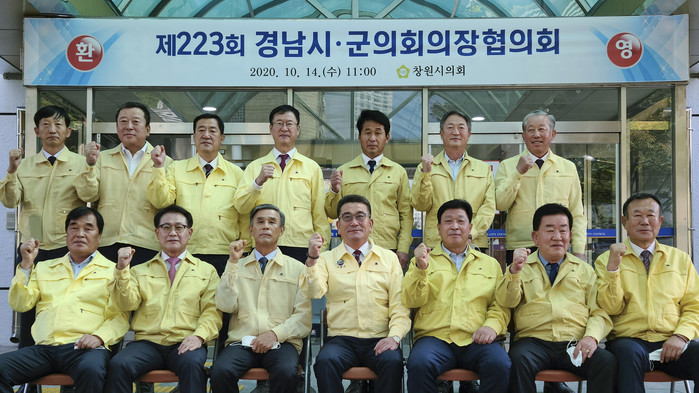 | ▲ 경남시군의회의장협의회 소속 의장들이 창원시에서 열린 제223회 정례회에 참석해 '댐 방류 침수피해에 따른 피해보상 및 감사원 감사 등 촉구건의문'을 채택했다. 사진은 이날 정례회에서 기념촬영을 하는 의장들의 모습. (사진제공=합천군의회) |