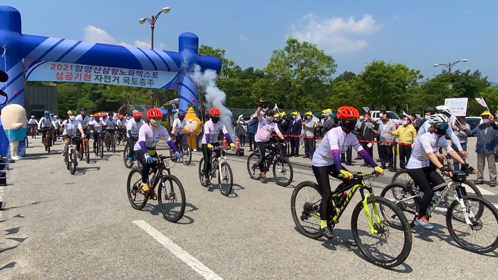 | ▲ '2021 함양산삼항노화엑스포 성공기원 자전거 국토종주' 대회 참가자들이 힘차게 출발을 하고 있다. (사진제공=함양군청) |