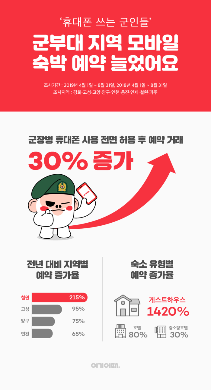 [시민일보 = 고수현 기자] 국내 1위 종합숙박·액티비티 예약 서비스 여기어때는 우리나라 현역 병사의 일과 후, 휴대전화 사용이 전면 허용된 지난 4월부터 8월까지 군 부대 인근 숙소 온라인 예약이 전년 동기 대비 30% 이상 증가했다고 24일 밝혔다.