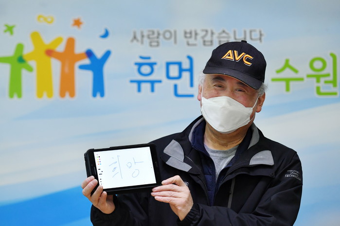 | ▲수원시와 수원다시서기노숙인종합지원센터의 도움으로 자활에 성공한 A씨가 ‘희망’이라는 글씨를 써보이고 있다. (사진제공=수원시청) |