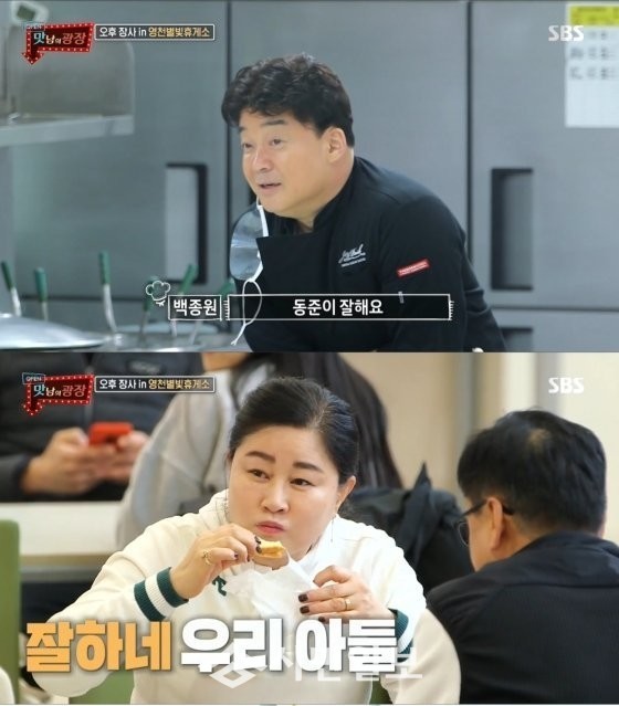 주방에서 요리하던 백종원도 놀란 표정으로 "어떻게 알고 오셨냐"고 묻자 김동준의 어머니는 "서울에서 부산 내려오는데 장사한다길래 한번 들러 봤다"며 너스레를 떨었다. 이에 백종원은 "맛있게 드시라. 동준이 잘한다. 그냥 하는 소리가 아니라 진짜 잘한다"며 훈훈함을 선사했다.