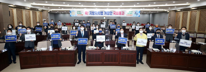 이날 시의회 의원들과 염태영 수원시장은 제2차 본회의 종료 후 수원 특례시 명칭 부여와 지방의회의 독립성 및 전문성 강화 등의 내용을 담은 지방자치법 개정안 통과를 축하하는 피켓 퍼포먼스를 펼치기도 했다.