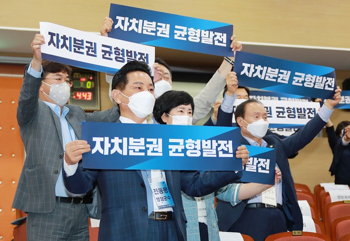 | ▲ ‘한국판 뉴딜’ 기초지방정부 정책제안 간담회에 참석한 전동평 군수가 '자치분권 균형발전' 플래카드를 들고 있다. (사진제공=영암군청) |