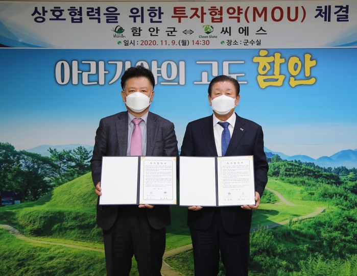 함안군은 지난 9일 오후 2시 30분 군수실에서 씨에스(CS)(대표 백목기)와 기업체 투자유치를 위한 투자협약(MOU)을 체결했다.
