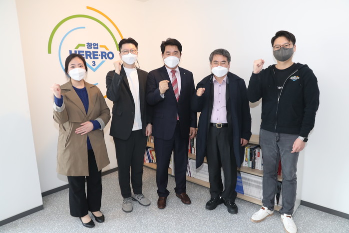 | ▲ 창업 HERE-RO3 시설을 방문한 박준희 구청장(가운데)이 관계자들과 기념촬영을 하고 있다. (사진제공=관악구청) |