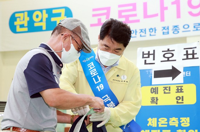 | ▲ 박 구청장이 예방접종센터에서 접종 대상자 노인을 안내하고 있다.(사진제공=관악구청) |
