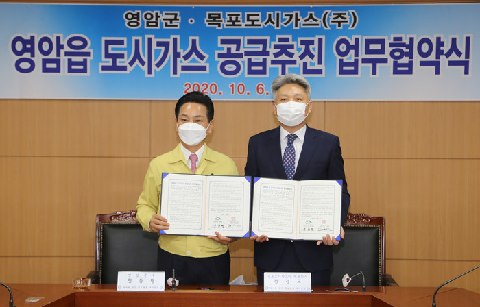 군에서는 이번 도시가스 공급 사업을 위해 지난 5월 영암읍 도시가스 공급사업 타당성 조사 용역을 실시해 경제성을 분석한 결과 경제력 타당성이 있다는 결론에 이르렀으며, 10월6일 군청 낭산실에서 전동평 군수와 정경호 목포도시가스(주) 대표이사 및 관계자들이 참석한 가운데 영암읍 도시가스 공급사업 협약서를 체결했다.