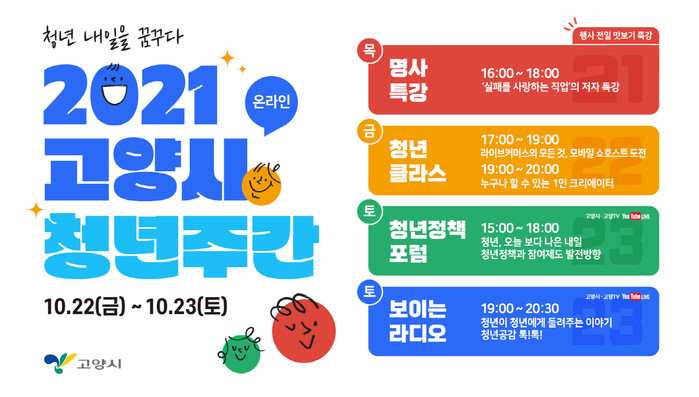 청년 클라스(2개 강좌)와 전야제 특강은 고양시 청년주간 홈페이지에서 사전 신청을 통해 온라인으로 참여할 수 있으며, 청년정책 포럼과 보이는 라디오는 고양시‧고양TV 유튜브에서 생중계된다.