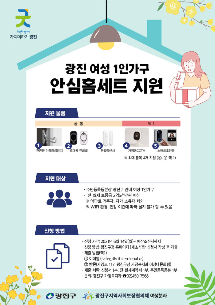 [시민일보 = 여영준 기자] 광진구(구청장 김선갑)가 여성 1인가구의 안전한 주거생활 조성을 위해 ‘안심홈세트’를 지원한다.