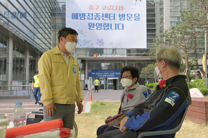 | ▲ 서 구청장이 백신접종센터에서 노인들과 이야기를 나누고 있다.(사진제공=중구청) |
