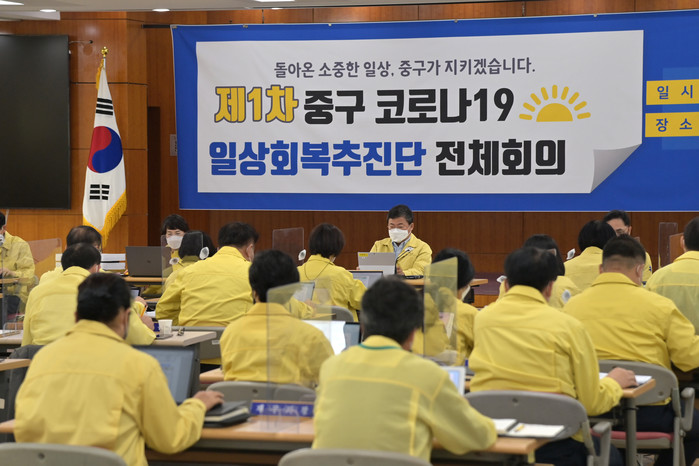 지난 10월21일 출범한 '중구 코로나19 일상회복추진단'은 구청장을 단장으로 5개 분과(▲시민 ▲생활복지 ▲생활도시 ▲경제 ▲보건) 18개 대응부서별 단계적 일상회복 로드맵을 마련했다.