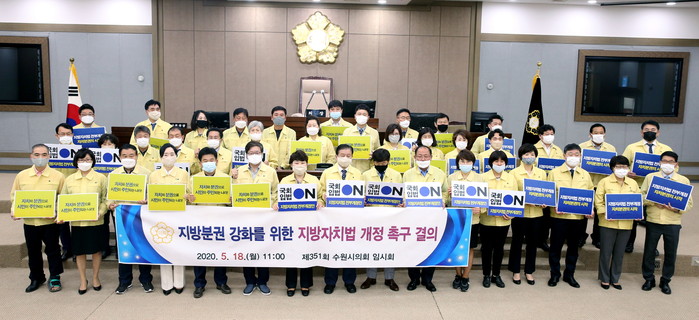| ▲ ‘지방분권 강화를 위한 지방자치법 개정 촉구 결의안’을 채택한 수원시의원들이 기념촬영을 하고 있다. (사진제공=수원시의회) |