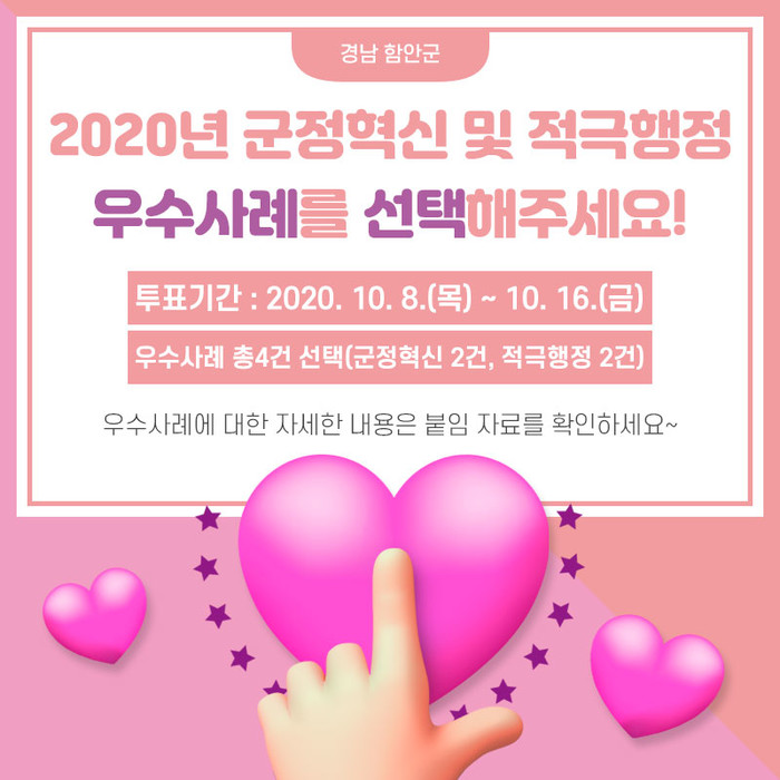 함안군은 군정혁신 및 적극행정 사례에 대한 발굴과 공유로 혁신을 주도하고 적극행정 분위기를 확산하고자 ‘군정혁신 및 적극행정 우수사례 온라인 경진대회’를 개최한다.