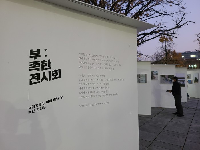종로 거리의 작고 소중한 존재들을 위한 전시회 ‘부ː족한 전시회’, 일명 ‘부인공들로도 족한 전시회’는 마로니에공원과 종로홍보관 등에 이벤트존, 포토존, 전시가벽 등 오는 12월13일까지 지역내 곳곳을 무대로 펼쳐진다.