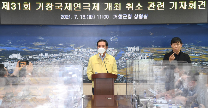 구인모 거창군수는 13일 군청 상황실에서 제31회 거창국제연극제를 취소한다는 기자 회견을 가졌다.