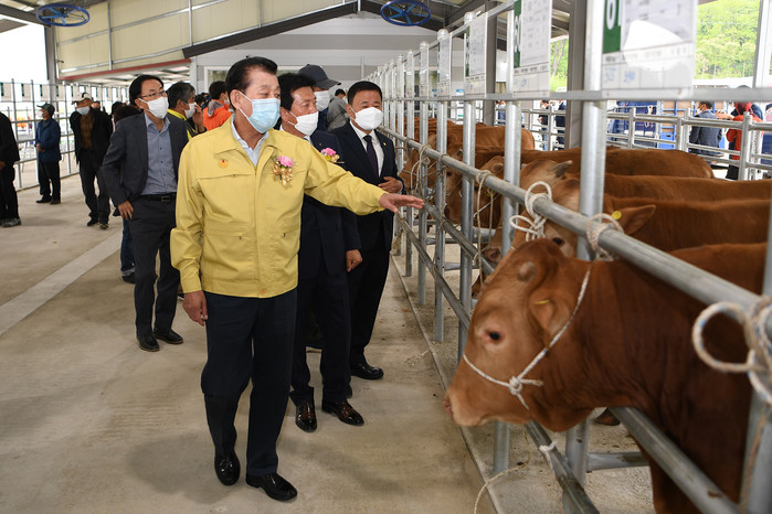 | ▲ 가축시장 준공식에 참석한 유천호 군수(맨 앞)가 소를 살펴보고 있다.(사진제공=강화군청) |