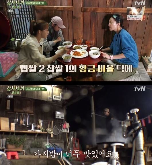 4일 방송된 tvN '삼시세끼 산촌편'에서는 세끼 멤버들이 역대급 한 끼로 가지밥과 더덕구이를 완성했다.