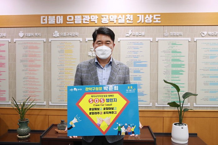 박준희 서울 관악구청장이 지난 10일 사회적 약자에 대한 폭력을 예방하고, 복지사각지대의 점진적 해소를 위해 주변 사회적 약자를 ‘살펴보고, 찾아보고, 알려주고, 지켜주자’는 취지의 캠페인 ‘복지 사각지대 발굴 SOS(Save Our Seoul) 챌린지’에 동참했다. 사진은 박 구청장이 챌린지에 동참하는 모습. (사진제공=관악구청)