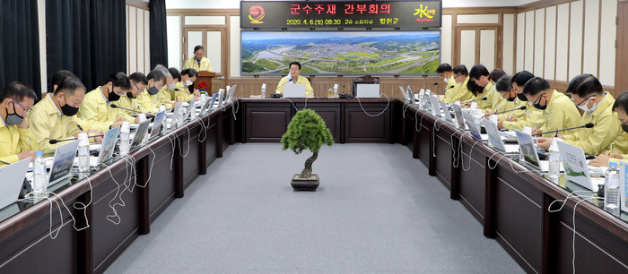합천군(문준희 군수)은 지난 6일 4월 간부회의를 열어 국회의원 선거 준비 철저, 봄철 산불예방 등 당면업무와 함께 지역경제 활성화와 사회적 거리두기 연장에 따른 대비책 마련에 대해 논의했다고 밝혔다.