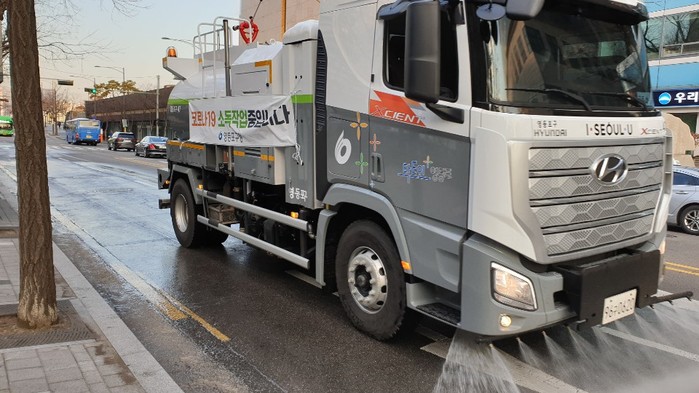 | ▲ 영등포구는 코로나19를 예방하기 위해 도로 물청소용 살수차 7대를 이용해 지역내 도로 388.8km를 대상으로 특별 방역작업을 전개했다. (사진제공=영등포구청) |