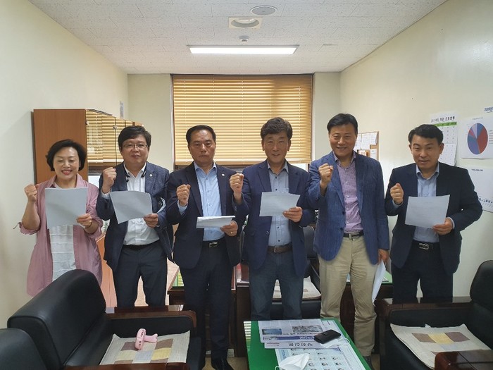 | ▲ 양천구의회 미래통합당 소속 의원들이 ‘김포공항 국제선 증편 반대’ 성명서를 발표하고 포즈를 취하고 있다. (사진제공=양천구의회) |