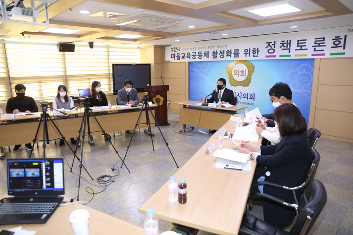 | ▲ 마을교육공동체 활성화를 위한 정책토론에 참여한 의원 및 관계자들이 회의하고 있다. (사진제공=수원시의회) |