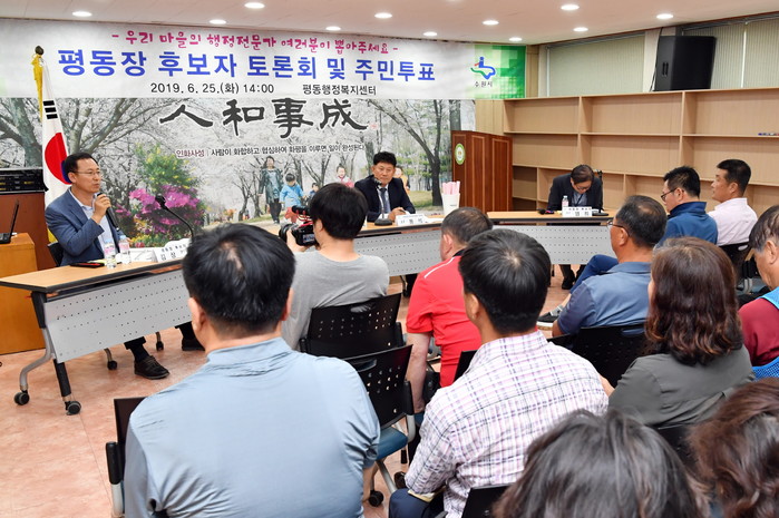 | ▲ 2019년 6월 동장 주민추천제가 실시된 평동에서 토론회가 열려 동장 후보자들이 주민들에게 정책을 설명하고 있다. (사진제공=수원시청) |