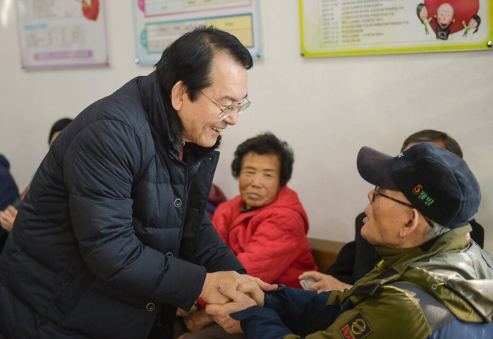 | ▲ 노인복지관에 방문해 노인과 인사를 나누고 있는 김종식 시장(왼쪽) 모습. (사진제공=목포시청) |