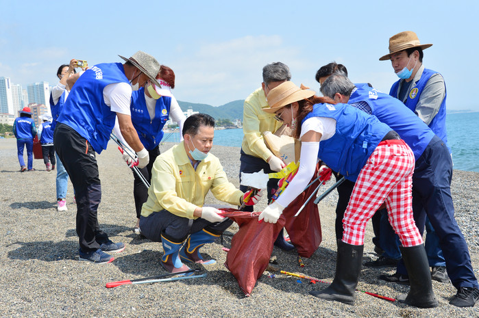 울산시의회 박병석 의장을 비롯한 의원들이 지난 7일 북구 산하동 강동해변에서 바르게살기운동 북구협의회 회원들과 쓰레기 수거 및 환경정화 활동을 펼쳤다. 사진은 의원과 회원들이 해안가 쓰레기를 줍고 있는 모습. (사진제공=울산시의회)