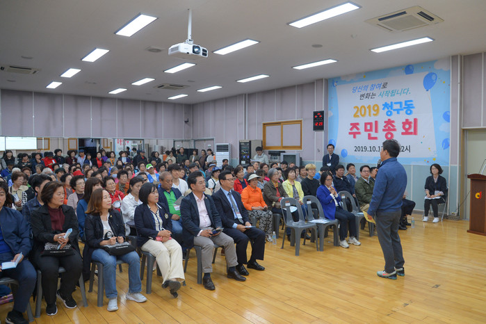 | ▲ 지난해 청구동 주민총회에 참석한 주민들이 서양호 구청장에게 동정부 사업에 대한 설명을 듣고 있다. |
