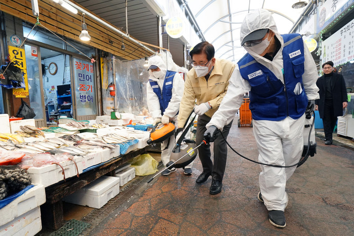 | ▲ 코로나19 예방을 위해 시장 구석구석을 소독하고 있는 유덕열 구청장(가운데)와 구청 방역직원들. (사진제공=동대문구청) |