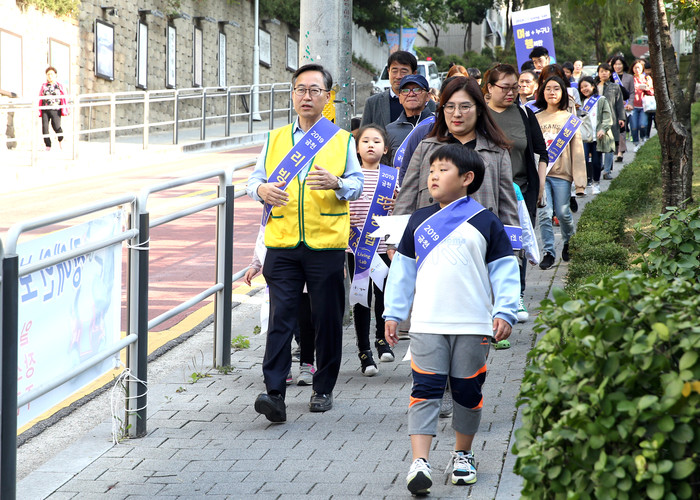| ▲ 지난 10월21일 유성훈 구청장이 어린이 수상자 및 주민들과 '통학로 안전 캠페인'을 진행하고 있다. |