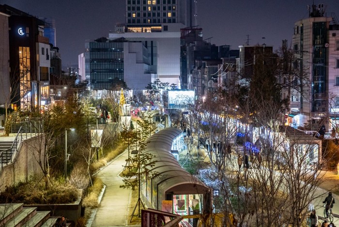 특히 경의선책거리 위 와우교의 레이저와 미디어 파사드는 경의선 숲길 전체를 형형색색의 눈 내리는 마을로 변신시킨다.