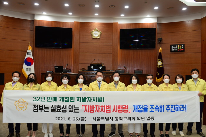 [시민일보 = 여영준 기자] 서울 동작구의회(의장 전갑봉)가 최근 열린 제310회 제1차 정례회 제2차 본회의에서 최정아 의원이 대표발의한 ‘자치분권 기틀 마련을 위한 지방자치법 시행령 개정 촉구 건의안'을 채택했다.