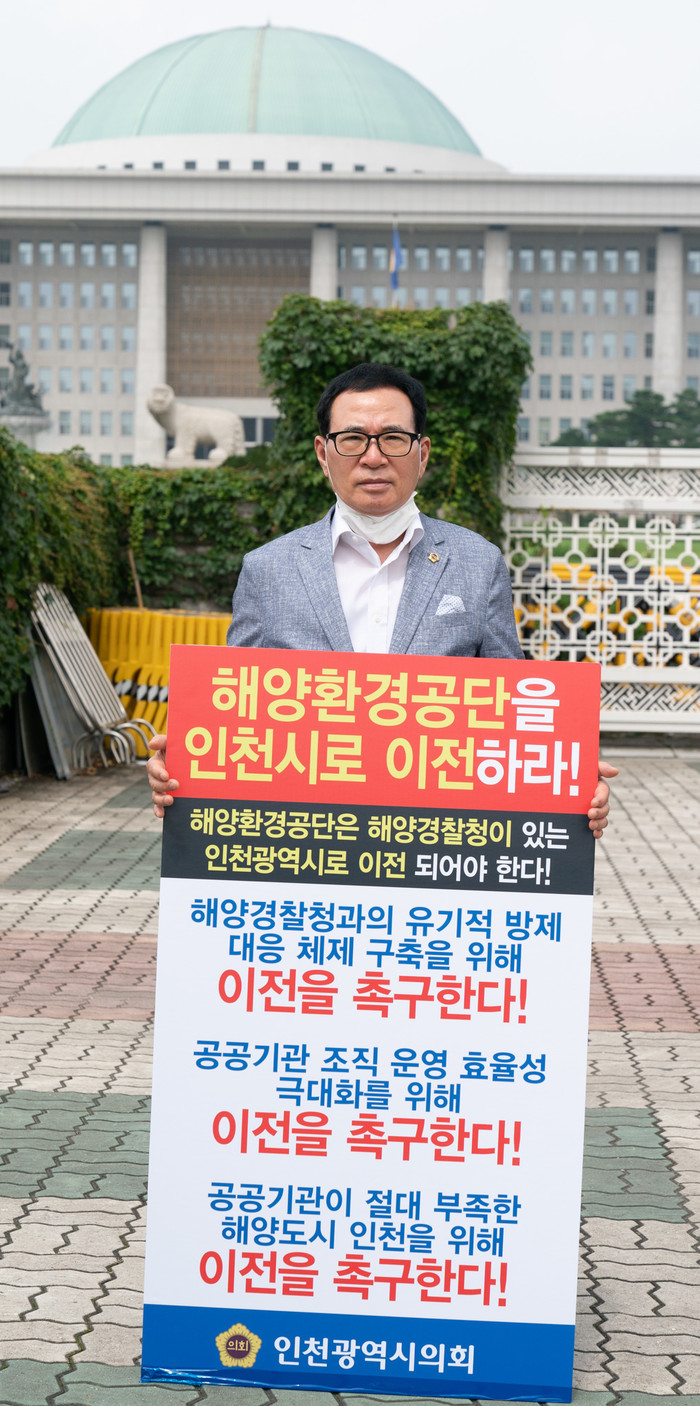 [인천=문찬식 기자] 인천시의회 이용범(계양3) 의원이 18일 국회에서 해양환경공단의 인천시 이전을 건의하며 1인 시위에 나섰다.