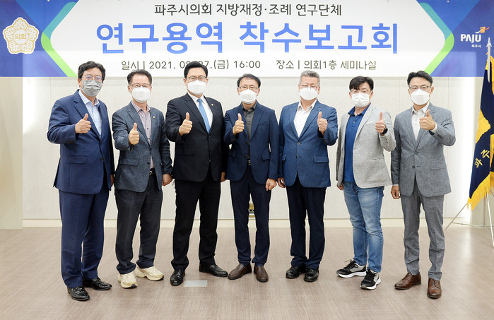 | ▲ 조례 효용성 제고를 높이기 위한 연구용역 착수 보고회에서 지방재정·조례 연구단체 의원들이 기념촬영을 하는 모습. (사진제공=파주시의회) |