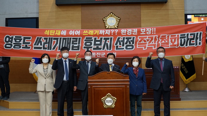 [인천=문찬식 기자] 인천 옹진군의회는 17일 옹진군청 본회의장에서 영흥도 쓰레기 매립장조성 결사반대 촉구 성명을 발표하고, 영흥도 쓰레기매립장 조성계획 철회를 요구했다.