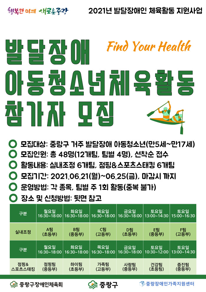 [시민일보 = 여영준 기자] 중랑구(구청장 류경기)가 코로나19로 몸과 마음이 지친 발달장애 아동 및 청소년 48명을 대상으로 체육활동 프로그램 참가자를 모집한다.